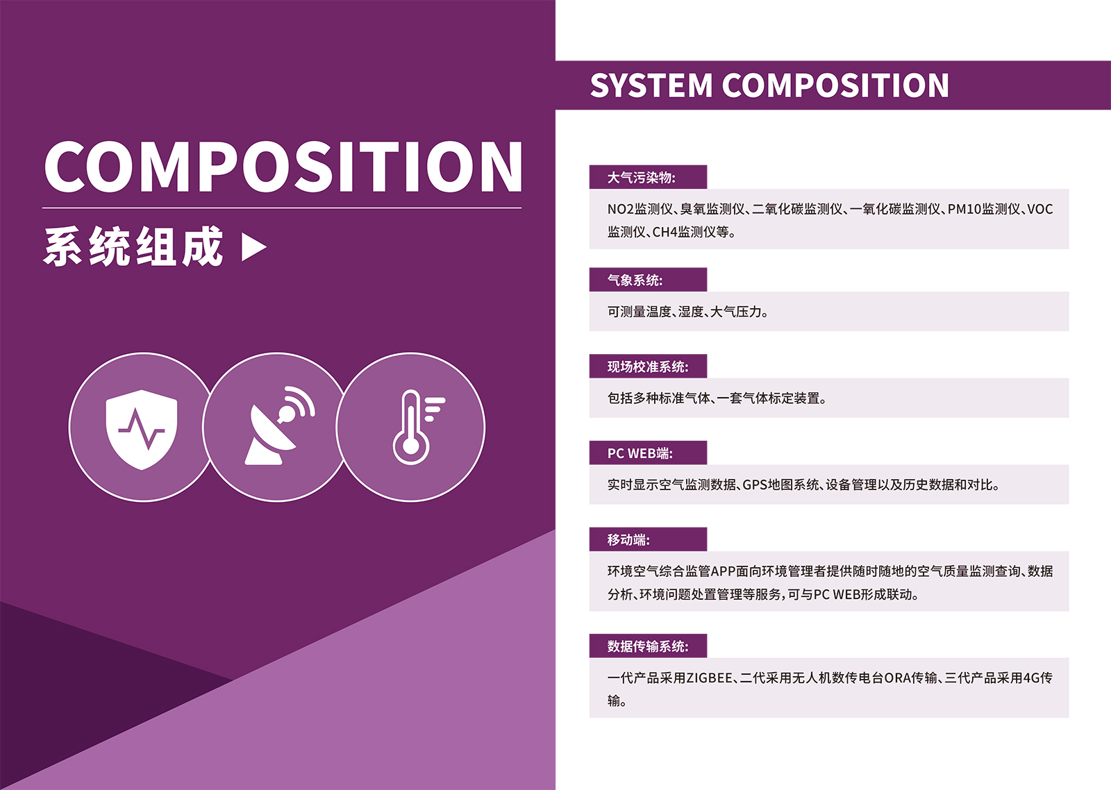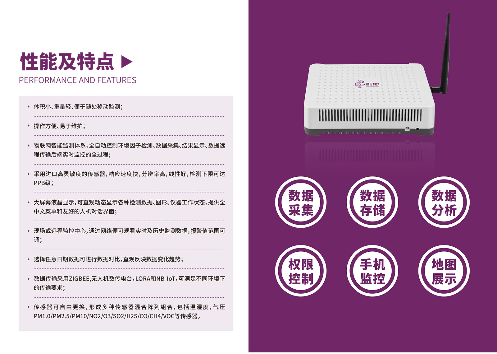 第一代产品采用ZigBee点对点透传,采用IEEE802.15.4标准规范的媒体访问层与物理层。主要特色有低速、低耗电、低成本、支持大量网上节点、支持多种网上拓扑、低复杂度、快速、可靠、安全。二代产品通过无人机数传电台和LoRa技术,无人机数传电台特点是高速率:115.2Kbps,提供可靠的无线通信,是为干扰严重的环境下使用而设计的, 有着无可比拟的顽存性,第三代产品则运用4G传输到服务器实现前端页面的展示和操作。大气监测系统通过对现场温度、湿度、PM2.5、CO2、CO、NO2、SO2、气压等参数的数 据采集,将参数数据远传至物联网云平台,实现现场各个设备的数据实时监测,用户可以通过电脑网页或是手机app实时查看,可以自由设置各个参数的标准值上下限,如果数据超限会有报警提醒,做到提前预警,避免造成不必要的损失,实现在远程就能值守现场设备。